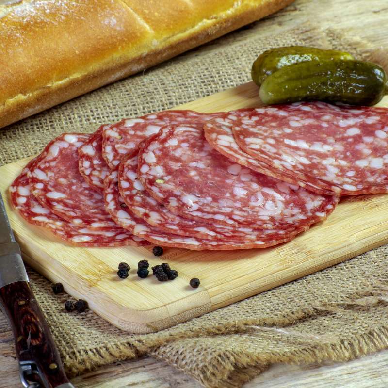 | Ingrédients | Viande de porc, sel, lactose, sirop de glucose, vin, dextrose, poivres, ail, muscade, antioxydant: érythorbate de sodium, conservateur: nitrate de potassium, ferments. |